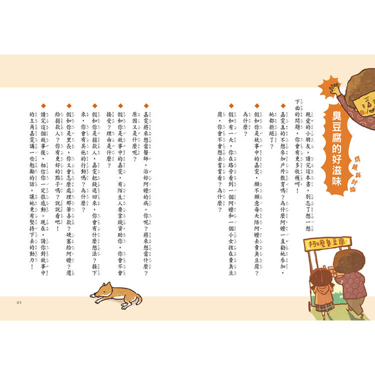 我們在書裡配了許多「彩色插圖」,希望能吸引孩子閱讀;我們在每個故事後放了「問題與討論」,希望能提供老師與家長導讀的便利,期盼孩子在閱讀這些故事之後,不僅快速提升語文能力,更能養成順暢閱讀的好習慣。