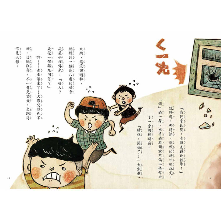 「糟糕,闖禍了!」大家嚇一大跳,還沒回過神,就聽到一個高八度的聲音從屋子裡傳來:「啥人?是佗一個猴死囝仔?」