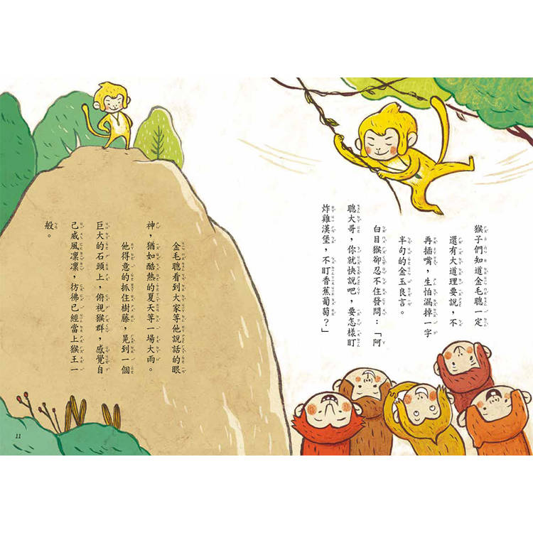 他得意的抓住樹藤,晃到一個巨大的石頭上,俯視猴群,感覺自己威風凜凜,彷彿已經當上猴王一般……