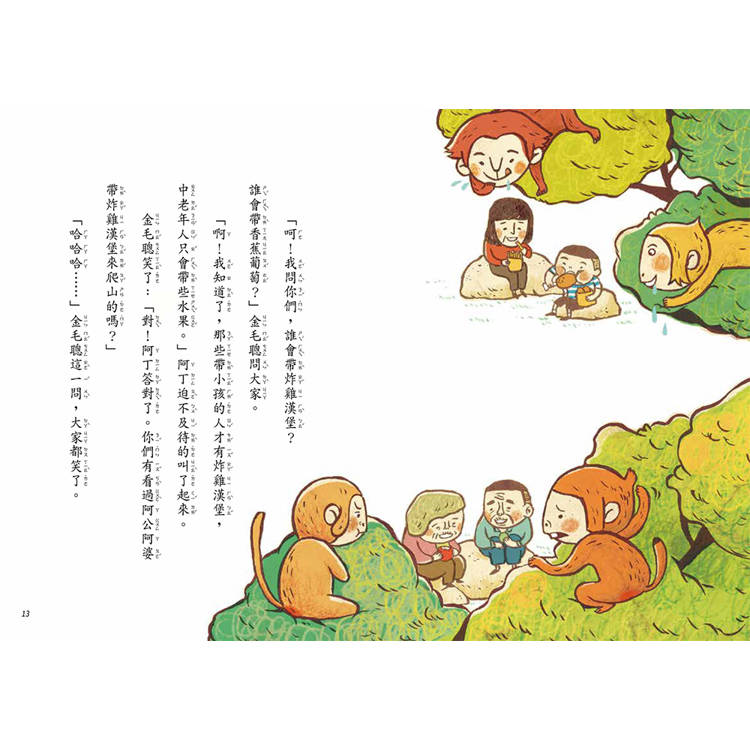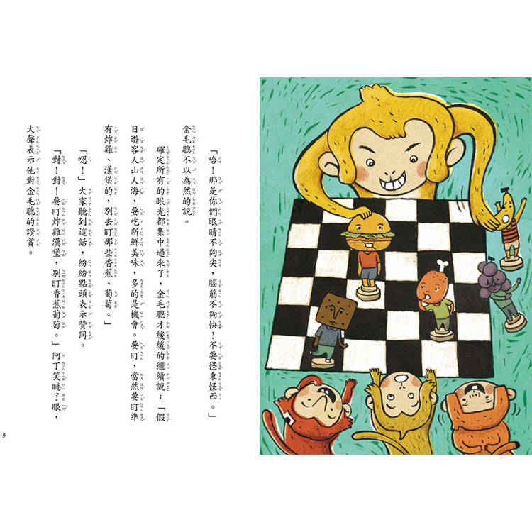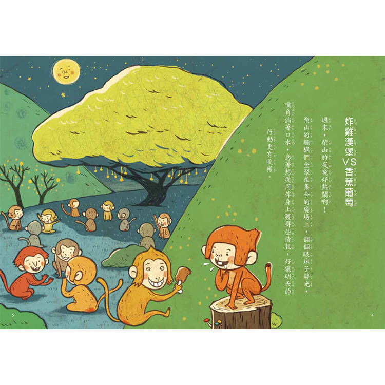 金毛聰是柴山猴群中,最耀眼的年輕獼猴。他動作快、眼力好,還發現了一個祕密:只要靠近人類,食物就會自己送上門!於是,他教猴群察言觀色、伸手討食,大家吃得輕鬆又開心。只有年邁的老猴王不斷提醒:「如果不靠自己找食物,總有一天會吃大虧的!」但誰聽得進去呢?大家只覺得老猴王太古板了。直到有一天—人類突然宣布:全面禁止餵食獼猴!習慣不勞而獲的猴群,突然不知道該怎麼活下去……故事提醒我們:真正的力量,來自不依賴別人的能力。