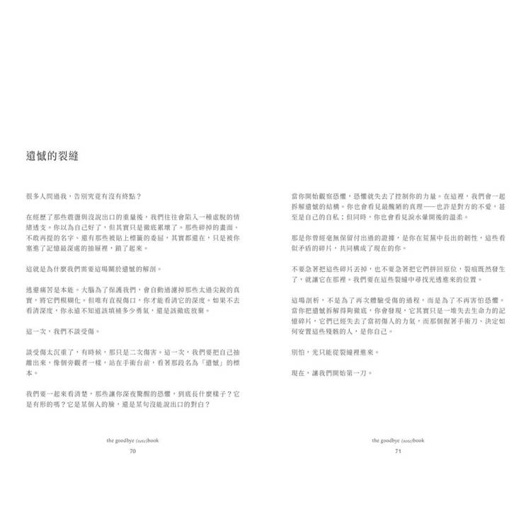 《the goodbye (note) book告別練習日記: 遺憾,是還留在過去的你自己》,透過書寫、停頓與自我對話的設計,
