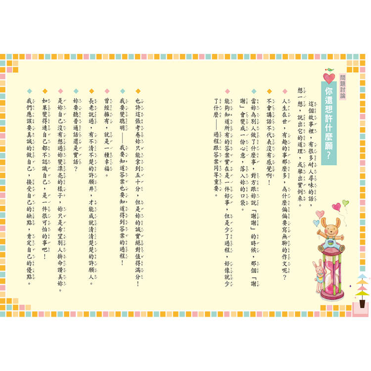 曼曼遇見一口許願井。那口井居然會說話!井告訴她,只要每天幫助別人,就能換來一個願望成真。於是,曼曼開始努力找機會幫助別人,也實現了不少願望——變漂亮、變聰明、變得更受歡迎……奇怪的事,願望一個個成真,她的心卻沒有變得更快樂,反而越來越空;反倒是幫助別人的時候,她感受到從未有過的溫暖與真實。曼曼終於明白,真正的快樂不是「得到更多」,而是「成為更好的自己」。她對許願井笑著說:「今天不許願!」因為她知道,最好的願望,早就在心裡發芽了。