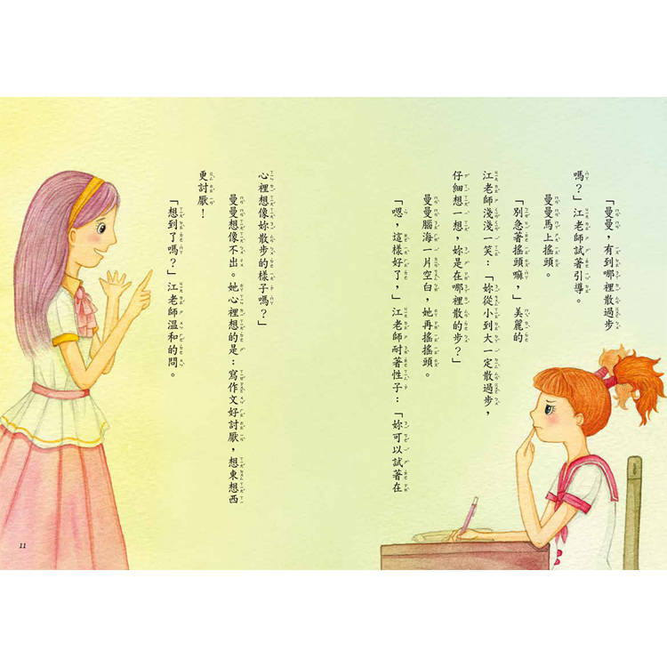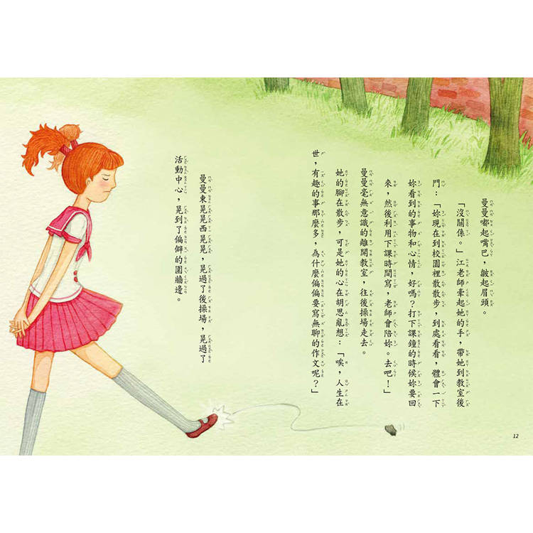 「沒關係。」江老師牽起她的手,帶她到教室後門:「妳現在到校園裡散散步,到處看看,體會一下妳看到的事物和心情,好嗎?打下課鐘的時候妳要回來,然後利用下課時間寫,老師會陪妳。去吧!」