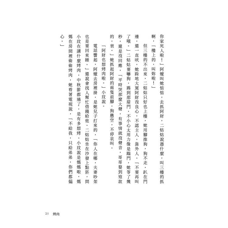 整個家庭陷入爭吵與混亂,小玟卻更在意媽媽的烤肉只分給弟弟,沒有分給她。 ──〈烤肉〉