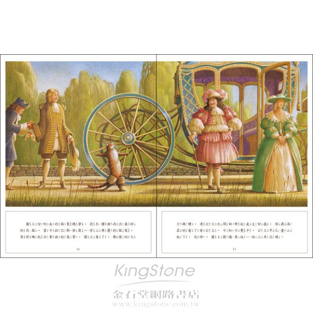 2.善用柔和、鮮活的色調。從P16 ~ 17的畫面,可以看到插畫家筆下的馬車,外形與用色都相當華麗、舒適,而國王與公主的打扮、衣著都好柔美鮮活。