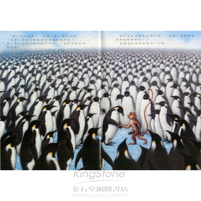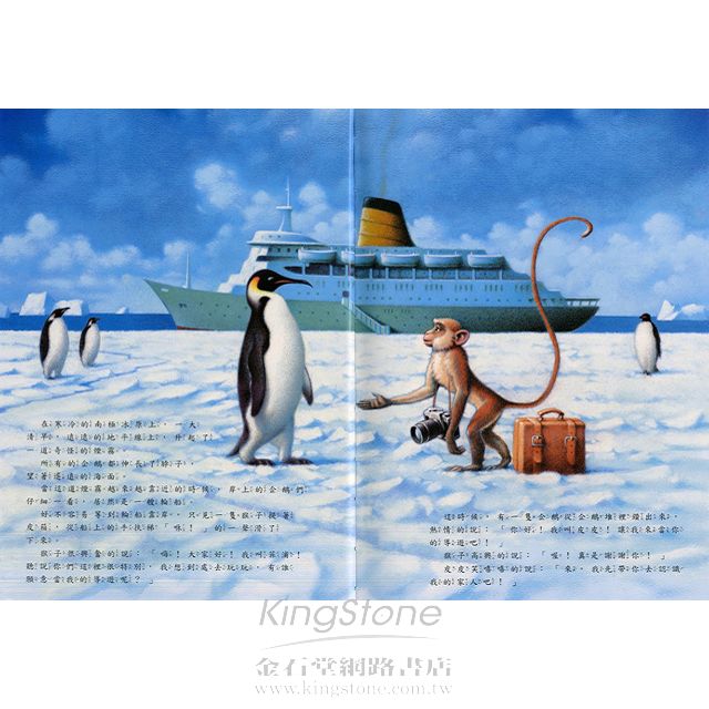 故事是這樣的:有一天猴子搭了船到南極去玩,他在冰上認識一隻企鵝,兩人一見如故,便結為好友。企鵝帶他參觀南極的冰原,可是天氣實在太冷了,猴子差點凍死。所以猴子決定帶企鵝到他的家鄉熱帶雨林去,但是那裡對企鵝來說又太熱了,而且他也對雨林的景致沒有興趣。他們該怎麼辦呢?