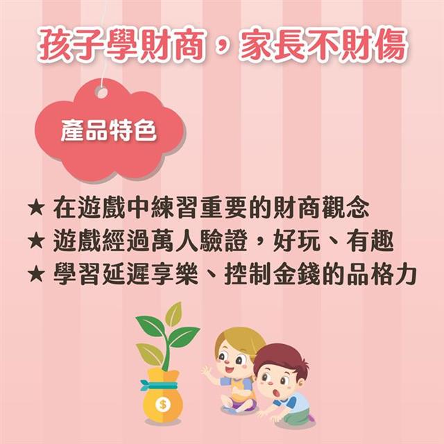 父母親是孩子的第一個金錢老師,說的話或行為將深深影響孩子一輩子的金錢觀,這套兒童理財產品以遊戲方式,可以有效協助父母親教導孩子,不用擔心不會教或教錯。