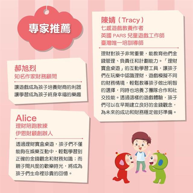 透過理財寶盒桌遊,孩子們不僅能夠在娛樂互動中,輕鬆學習到正確的金錢觀念和財務知識;而親子間共度的歡樂時光,將成為孩子們生命裡珍貴的回憶。