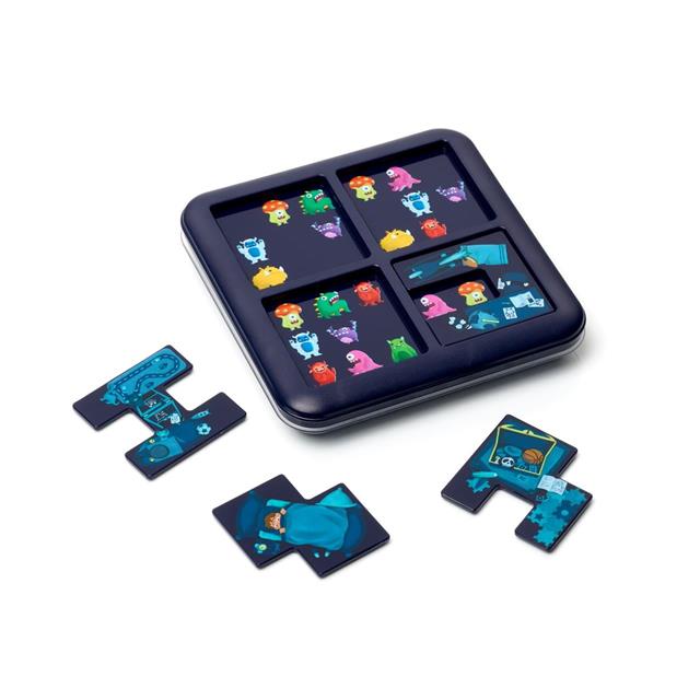 以小孩們又愛又怕的小怪物為主題,搭配關燈後黑暗房間的情境,設計出小怪物捉迷藏的遊戲。遊戲底盤為四個3x3的正方形空間,搭配七連方的拼圖板,當每個拼圖板放上底盤後,都會留下2個沒有覆蓋的位置,讓孩子練習透過數算與推理來思考解題。透明盒蓋設計,方便收納與攜帶,居家或出遊時進行遊戲都合適。搭配60個遊戲關卡,由淺入深,提升規劃力與專注力,增進空間概念與解決問題的能力。