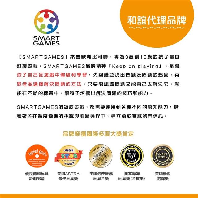 【SMARTGAMES】來自歐洲比利時,專為3歲到10歲的孩子量身訂製遊戲,SMARTGAMES品牌精神「Keep on playing」,是讓孩子自己從遊戲中體驗和學習,先認識並找出問題及問題的起因,再思考並選擇解決問題的方法,只要能認識問題而又能自己去解決它,就能在不斷的練習中,讓孩子逐漸培養出解決問題的技巧和能力。SMARTGAMES的每款遊戲,都需要運用到各種不同的認知能力,培養孩子在循序漸進的挑戰與解題過程中,建立勇於嘗試的自信心。