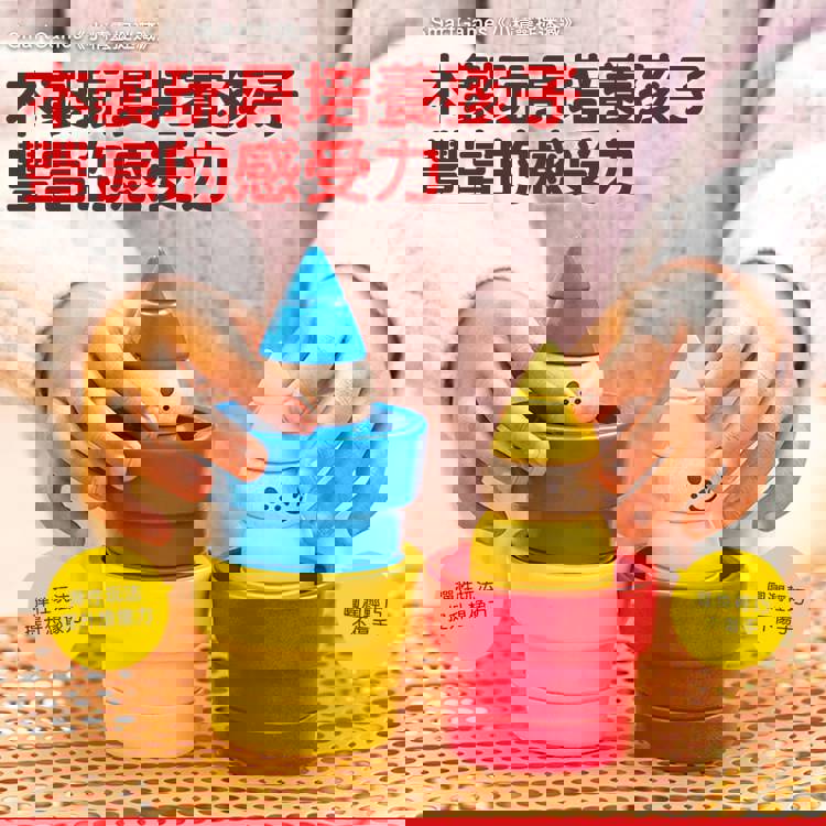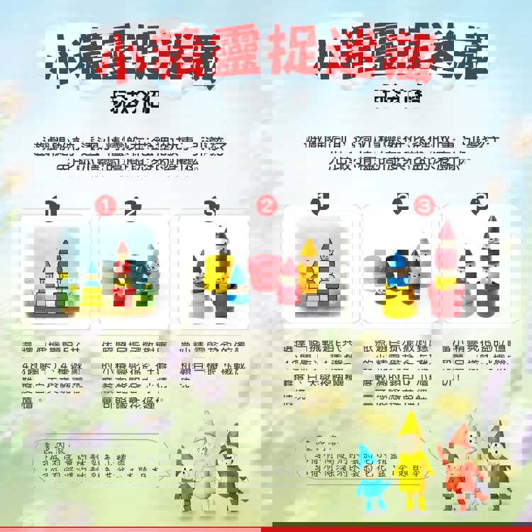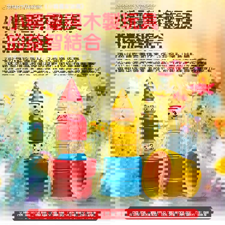 可愛的小精靈在花園裡打造了家,白天玩捉迷藏,晚上睡覺。彩色木製的小精靈與不同深度的花盆設計,讓幼兒在操作時更具真實感。遊戲過程中可透過堆疊、數數的方式,初步建立推理概念與多種認知能力。
