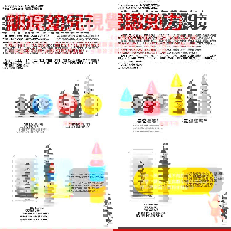 ●視覺辨識:不同高度、深淺與色彩設計,讓幼兒學習辨識形狀、顏色和物體。