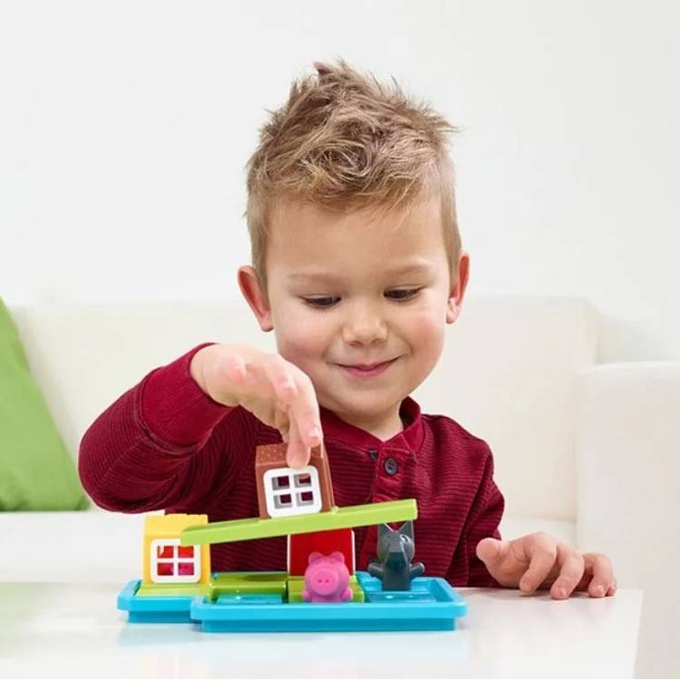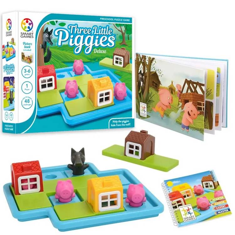 童話故事的情境延伸,讓幼兒容易理解遊戲規則,三隻小豬、大野狼主角偶與立體房屋的設計,讓學齡前的幼兒在操作時更具真實感。搭配白天小豬蓋房屋與夜晚躲避大野狼的情境,共48個遊戲關卡,由淺入深,提升幼兒視覺與空間概念並提升解決問題的能力。