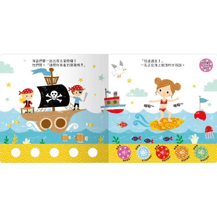 《聽!洞洞裡有聲音!》系列書,每本故事書都設計五種豐富的聲音,供孩子與正在閱讀的故事互動,只需要按下按鍵,就能夠聽見海浪的聲音、蒸汽船鳴響的轟鳴聲、以及魚群在水下吐出泡泡的環境聲,可以帶給孩子聽覺上的刺激,幫助孩子累積感官經驗,幫助他更認識世界!