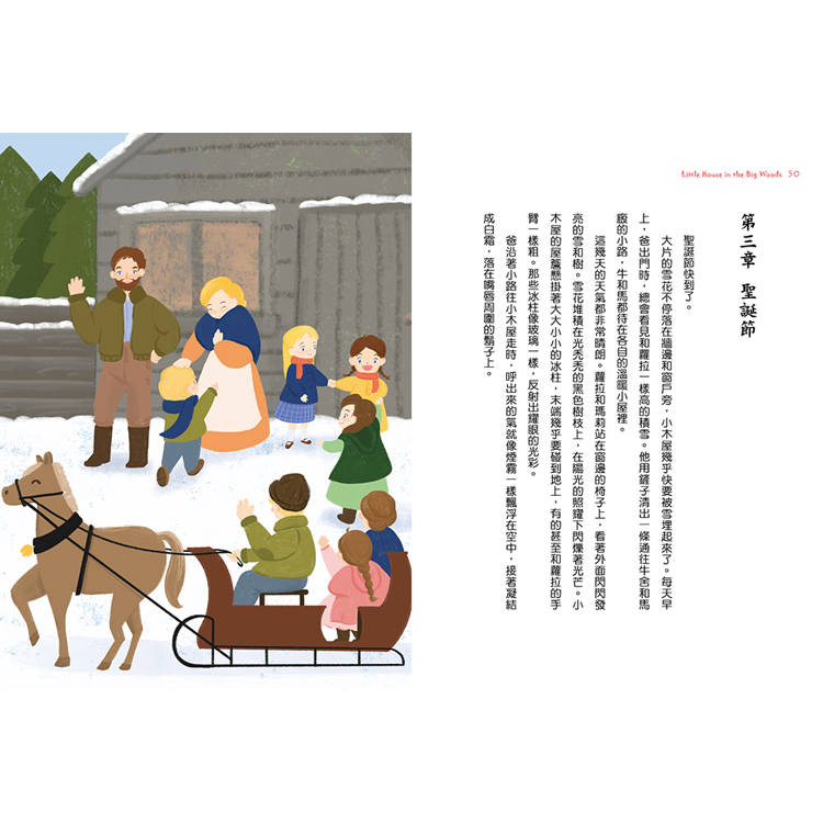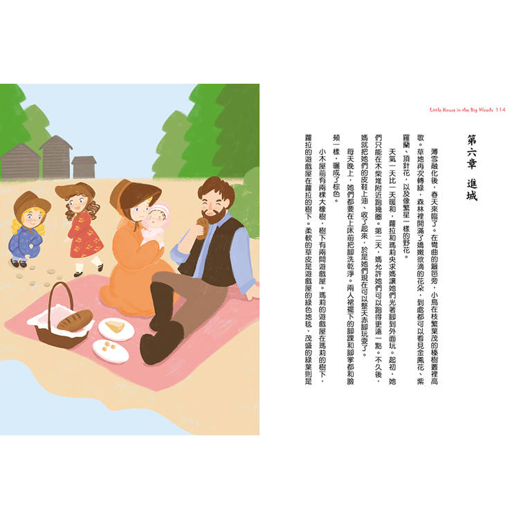 蘿拉一家居住在廣闊的威斯康辛大森林裡,他們得辛勤耕作、用獵來的獸皮以物易物,才能夠溫飽,而且還必須隨時留意野生動物的動靜,以免遭遇突襲。儘管這樣的生活在外人看來備嘗艱辛,但透過五歲小女孩蘿拉的眼睛觀看,一切都是那麼地新奇有趣。