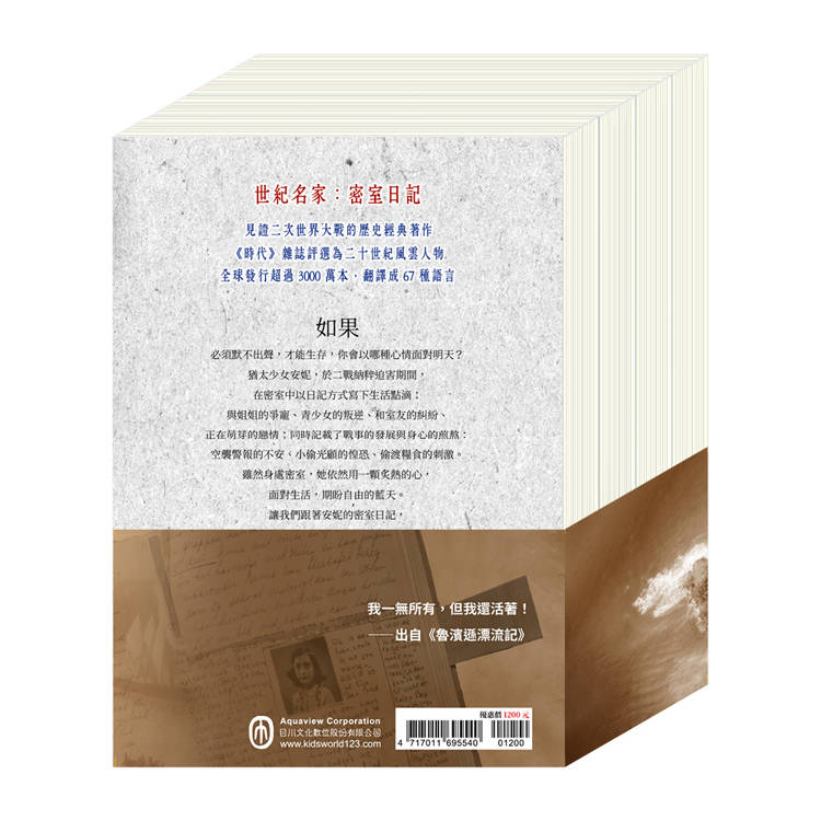 第二次世界大戰期間,躲藏在閣樓裡的猶太少女安妮,在日記上寫下少女點點滴滴的心情記事:和姊姊爭寵、跟媽媽抗爭、與室友糾紛,以及情竇初開的忐忑和甜蜜。也寫下自己的內心煎熬,空襲警報中的不安、糧食危機的困頓,在艱困下,並沒有抹滅她那顆樂觀的心,及對未來的嚮往!
