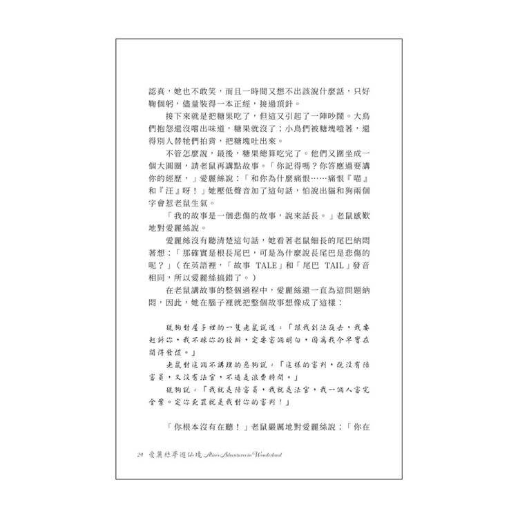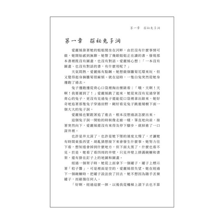 奇裝異服又形色慌張的兔子,深不見底的神祕兔子洞。這一跌,讓好奇心旺盛的愛麗絲,跌入一個奇幻神秘的夢中世界。忽大忽小的身體,淚水積累的眼淚池;口出人言的動物,神出鬼沒的柴郡貓;永不結束的茶會,生死一線的槌球遊戲。