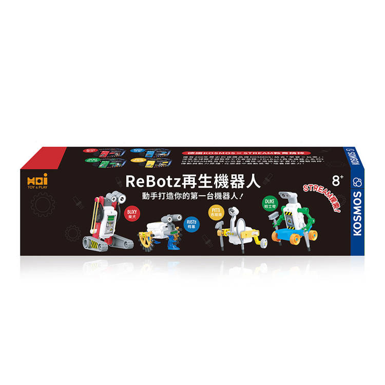 來自德國KOSMOS的 ReBotz 再生機器人全套禮物組。一次擁有四款不同造型的機器人:運用「槓桿原理」推動滑行的哈士奇、透過「滑動拉桿機構」實現自動翻身的吉娃娃、結合「凸輪應用」與「彈力傳動」的柴犬、運用「半圓形棘輪」實現翻越障礙與斜坡挑戰的柯基。