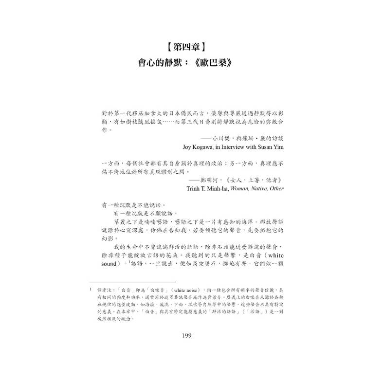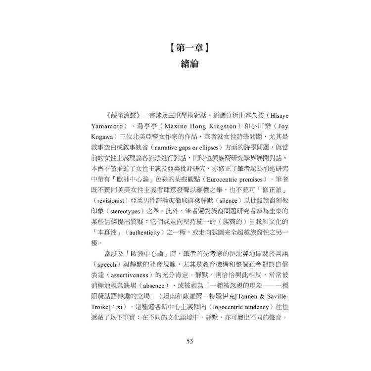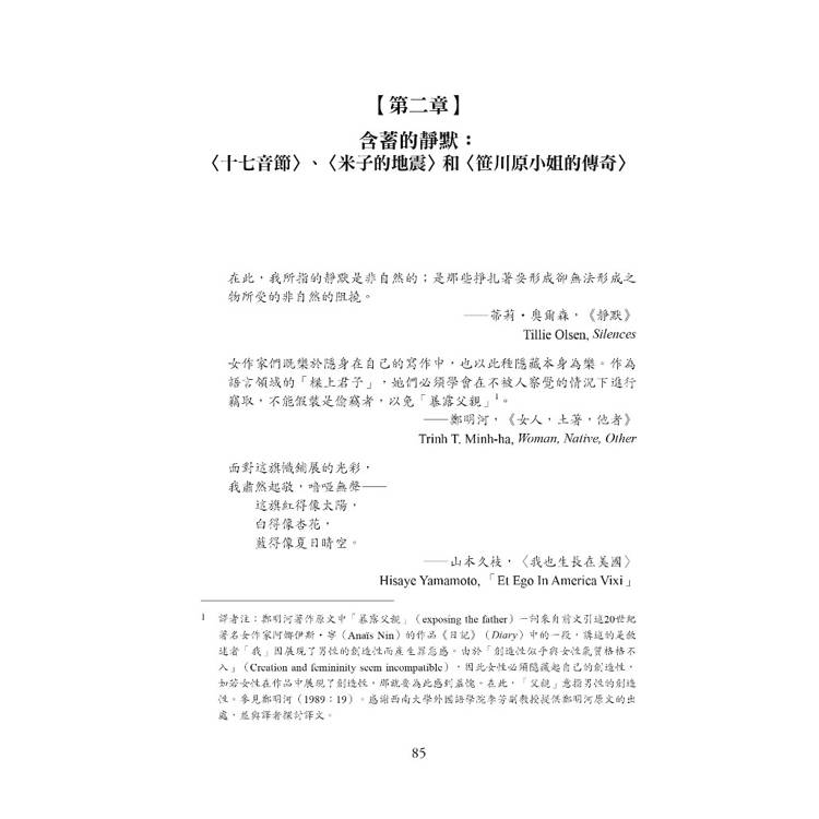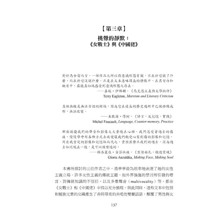 作者借鑒相關理論,挑戰了將言論與沉默二元對立的歐洲中心論述,批判了推崇言論的英美女性主義者,也反駁了部分亞裔美國男性批評家試圖以語言主權重塑身份的修正主義立場。三位作家巧妙交織言說與沉默、自傳與虛構,改寫亞洲與歐美文學傳統,並透過去中心化與質疑權威的敘事方式,重塑個人與族群的歷史,展現三位作家在沉默主題上的共通與獨特之處。