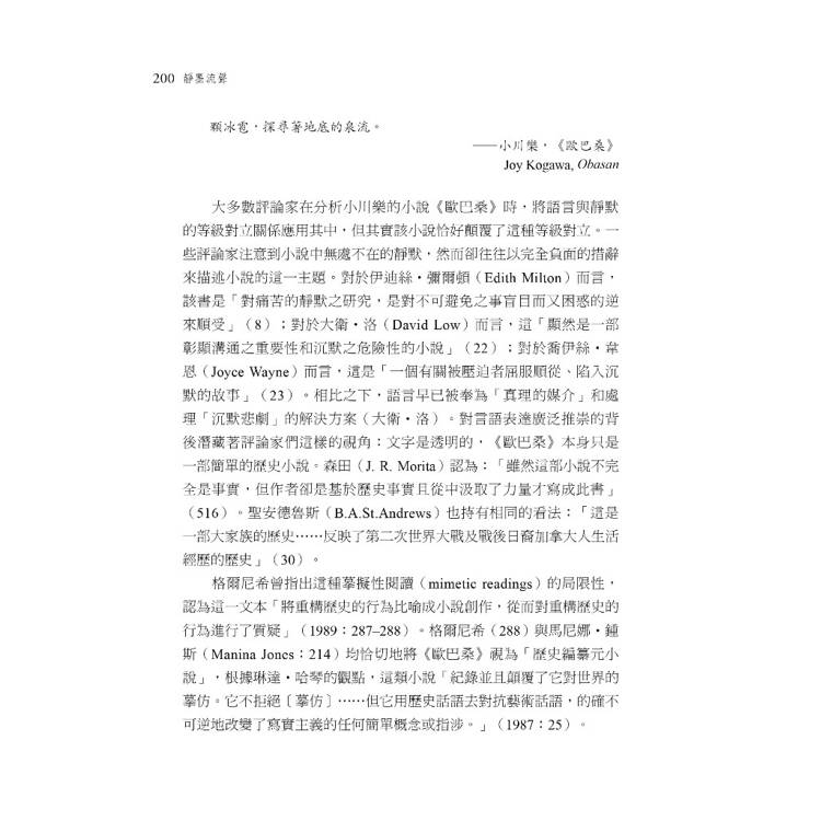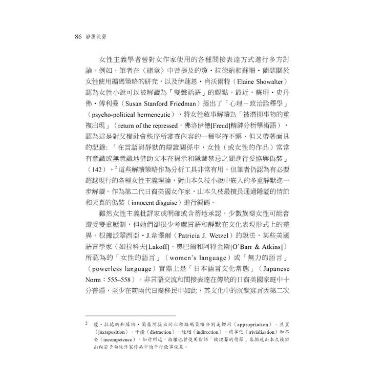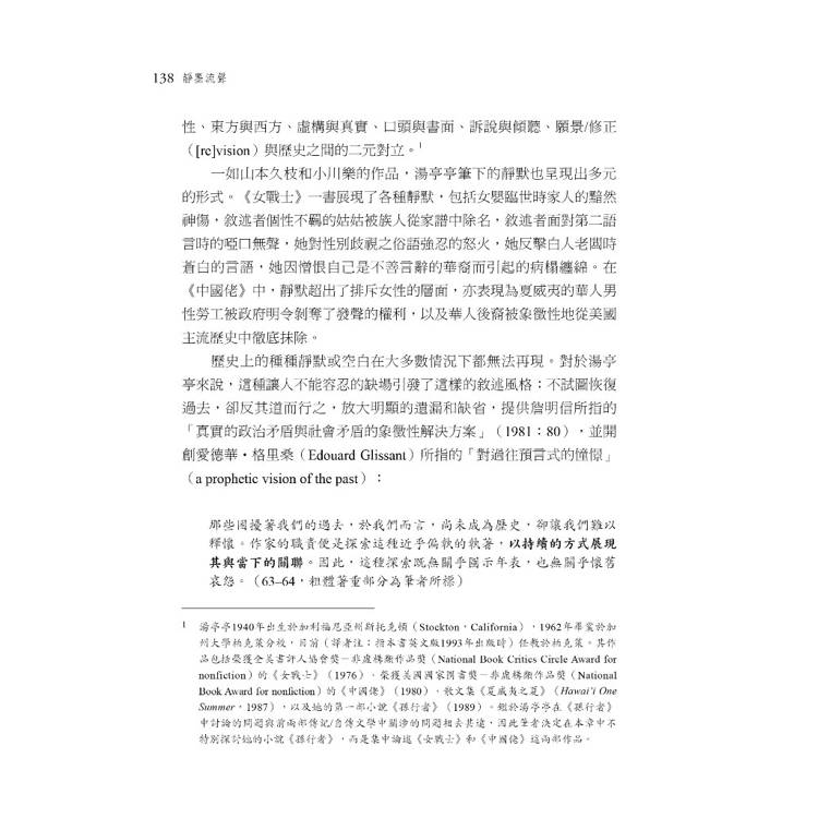 《靜墨流聲》為作者探討華美文學批評的首部專著,以「靜默詩學」為核心,探討亞裔美國文學中「無聲勝有聲」的別樣風情。全書聚焦山本久枝、湯亭亭和小川樂三位作家如何在小說中運用「沉默」作為主題與修辭手法,表達難以言說的情感與歷史創傷,挑戰族裔、性別與文化所加諸的壓迫。