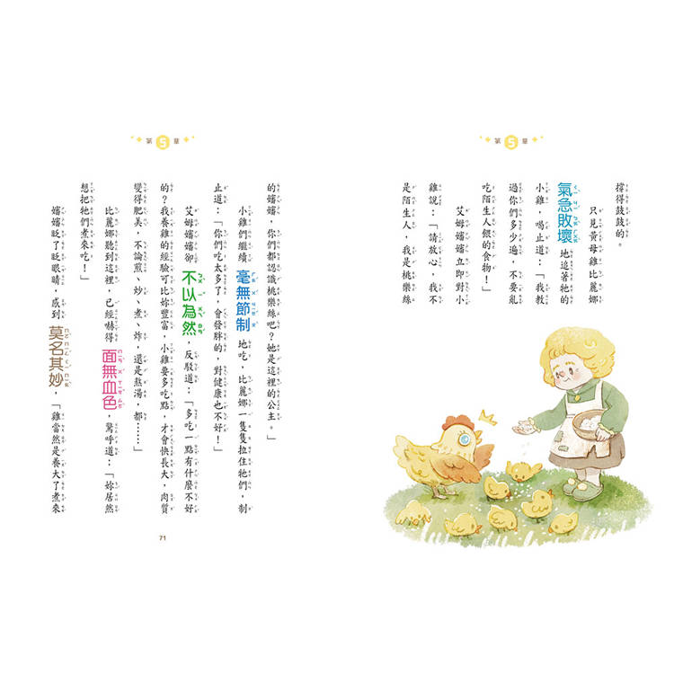 話音未落,一大群小雞已經湧進書房來,黃母雞比麗娜吃力地追著牠們,大叫著:「桃樂絲、小桃樂絲!快回來!」