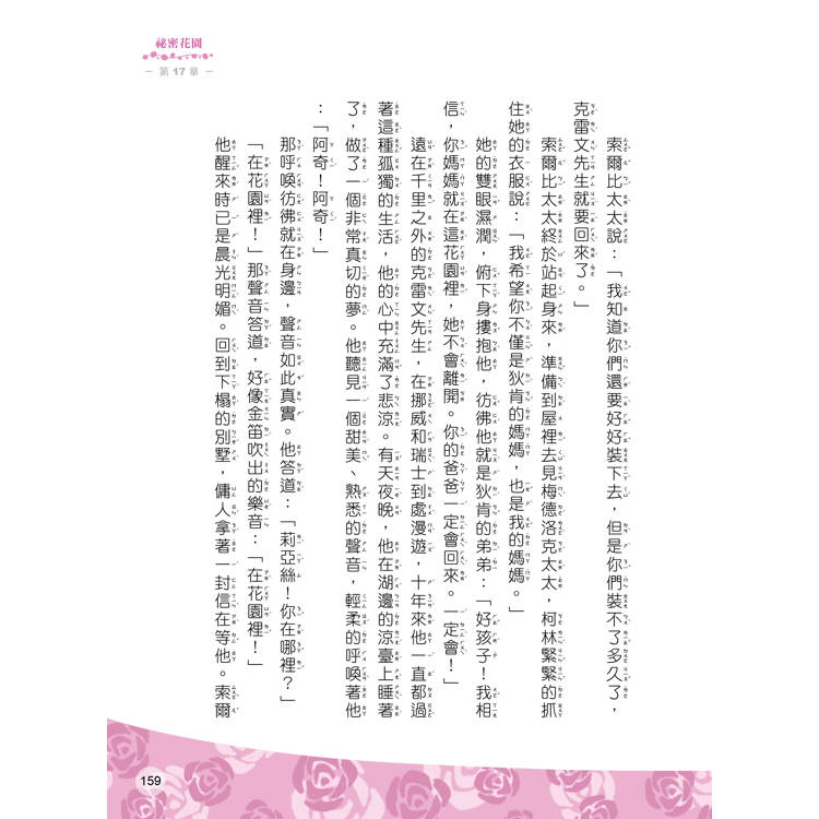九歲的瑪麗家境優渥,卻得不到父母的關愛,成了個性驕縱孤僻的女孩。失去至親後,她從印度被送到英國由姑丈扶養。有一天,她發現這個落寞的莊園新家,藏著一座荒廢已久的神祕花園,躲著一位耽溺自憐的愛哭男孩。究竟花園和男孩隱匿著什麼祕密呢?