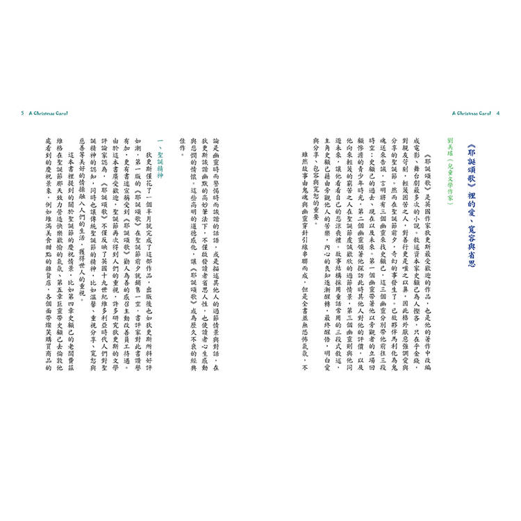 這本是英國作家狄更斯最受歡迎的作品,也是他的著作中改編成電影、舞台劇最多次的小說。敘述資本家史顧己為人慳吝,只在乎金錢,對親友苛刻,輕蔑困苦之人,對善行更是嗤之以鼻,因此格外厭惡強調愛與分享的聖誕節。然而在聖誕節前夕,奇幻的事發生了。已故夥伴馬利化為鬼魂送來告誡,言明將有三個幽靈來找史顧己,這三個幽靈分別帶他前往三段時空:史顧己的過去、現在以及未來。第一個幽靈帶著他以旁觀者的立場回顧慘澹的青少年時光,第二個幽靈領著他探訪此時其他人對他的評價,以及他向來輕蔑的窮苦之人在聖誕節時虔誠歡欣的過節情景,第三個幽靈則與他同遊未來,讓他看看自己的悲涼喪禮。故事結構採用童話常用的三段式敘述,主角史顧己藉由旁觀他人的苦樂,內心的良知逐漸醒轉,最終醒悟,明白愛與分享、包容與寬恕的重要。