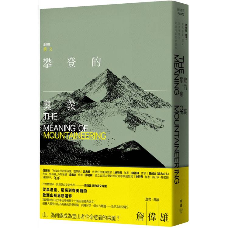 冰河、角峰、刃嶺滿布的阿爾卑斯山脈,是西方登山運動的搖籃,也是自然和文明激盪交錯的思想疆域、生死交相輝映的矛盾舞台。《攀登的奧義》來自不同的時代、不同的文化、不同的環境,猶如一曲陽春白雪,引領有緣人一窺西方登山的核心,也或可嶄露一個不分古今中外,由登山者所共享的心靈圖騰。