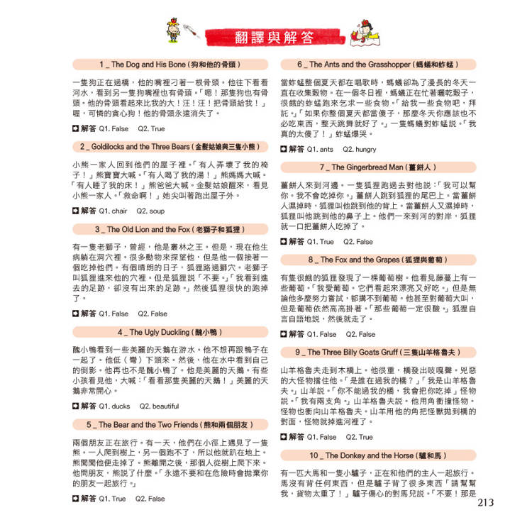 ‧書中共有100個小主題,包含:安徒生童話、伊索寓言,以及美國、加拿大、英國、德國、法國、瑞士、東歐、義大利、日本、印度等各國童話。彙集全世界孩子閱讀最多的名著佳作,除了可以讓孩子吸收知識外,也是學習英文的最好素材。