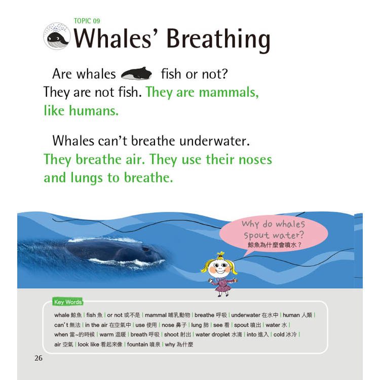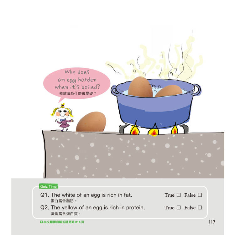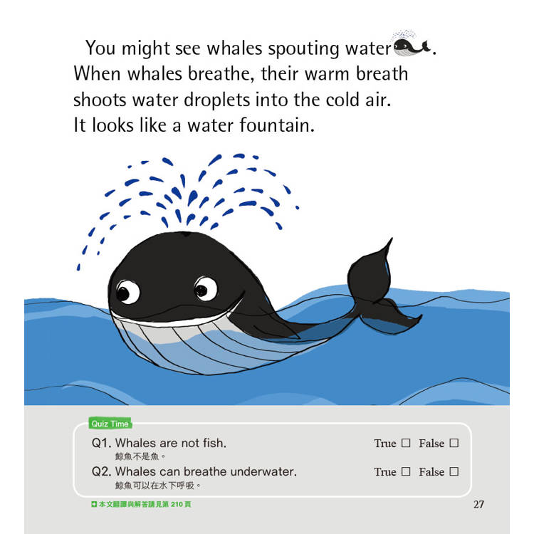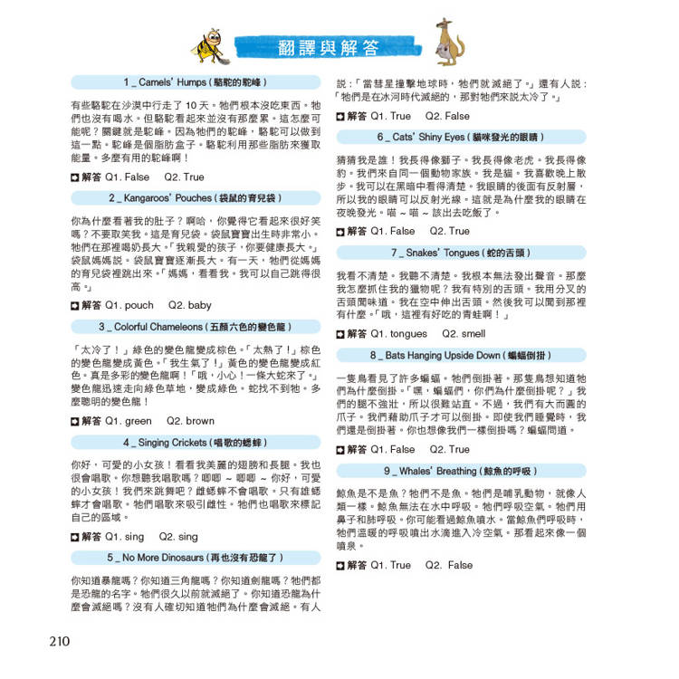 ‧書中共有100個小單元,包含:身體奧妙、動植物、科學與科技、自然與宇宙等4個領域的自然科普知識,有許多內容與生活息息相關,除了可以讓孩子吸收知識外,也是學習英文的最好素材。