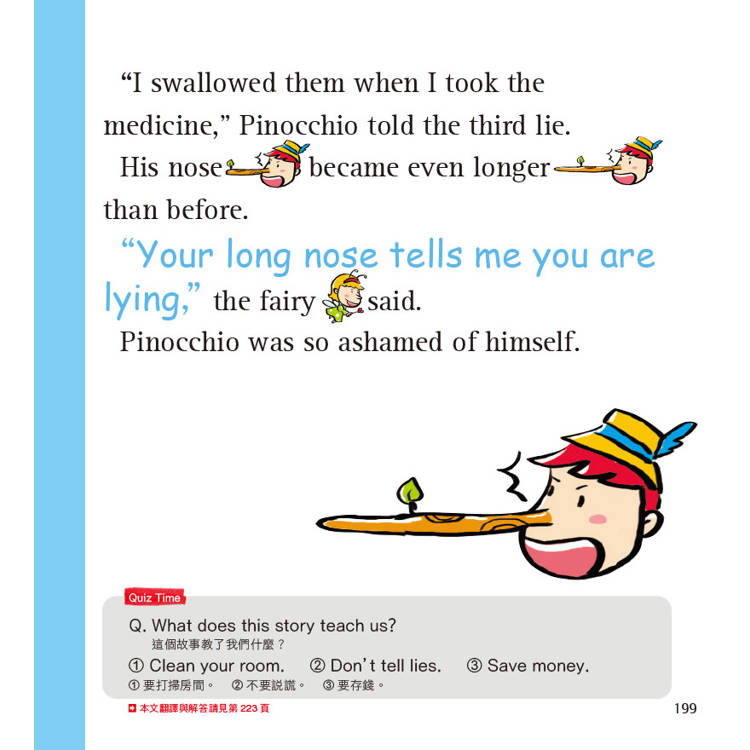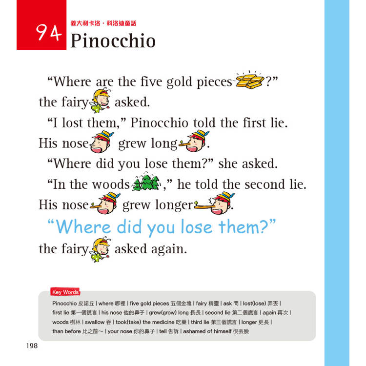 ‧每個跨頁就是一篇知名的故事,以有趣的句子搭配富有童趣的插圖,重現故事中的經典場面與劇情,降低閱讀英語讀物的負擔。