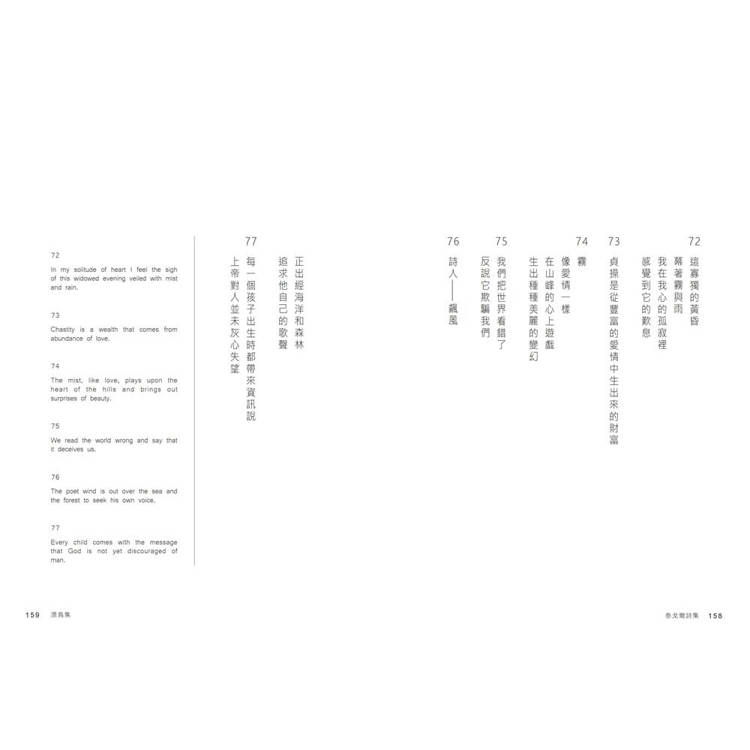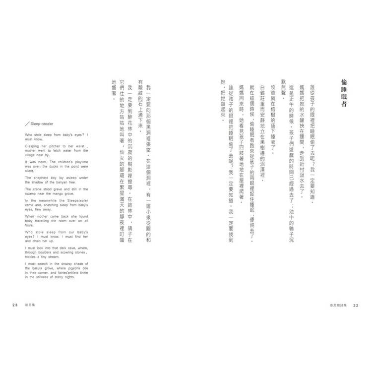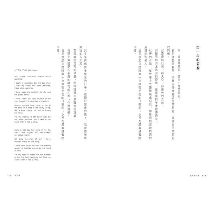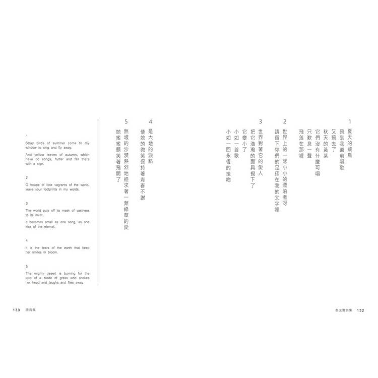 《新月集》及《漂鳥集》最初以孟加拉語撰寫,隨後由泰戈爾親自譯為英文出版,英譯作品(包括著名的《吉檀迦利》)通常被視為「再創作」而非逐字翻譯;由於泰戈爾本身對英文有著極佳的掌握度,他的這些「自譯本」不僅保留了原著的詩意,更在當時的英語世界產生巨大影響,這也是他能以詩集享譽國際、甚至影響後世文學的重要原因之一。
