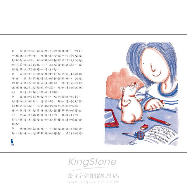 真是大驚喜,今天一大早我就發現小莉生了小寶寶,從現在起,我要把牠訓練成叫牠坐的時候就會坐下來。牠長得很像小莉,大半都是白色,不過在牠背上,有一道像馬鬃一樣的硬毛,而且像小喬一樣紅紅的。我問爸爸,要是有人真的很聰明,要怎麼稱呼他呢?爸爸說:「叫天才吧,為什麼問呢?」我就說:「因為我想叫那隻剛出生的小天竺鼠『天才』,而且讓全世界都知道六月十日就是天才的生日啊!」