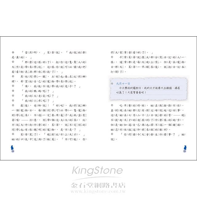 其實籠子裡關的,不過是一隻半大不小的小貓咪,但是一見到貓,天才的四條腿立刻軟得像果凍,腦袋也一片混亂。牠實在怕得要死,結果,牠立刻昏死了過去,就躺在那兒,一動也不動,連呼吸都好像停止了。牠聽見茱蒂的聲音在呼喚牠:「來吧!」當然牠又聽見她喊得更大聲了,「天才!快啊!」後來牠聽見一陣笑聲湧起,是全班竊笑的聲音,接下來是嗤嗤傻笑,最後簡直笑得人仰馬翻,笑聰明的茱蒂,和她聰明的天才,因為她向來誇耀得那麼神奇,那麼不厭其煩,然而這會兒,聰明的天才卻連一根肌肉也不曾動過。