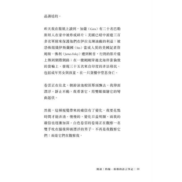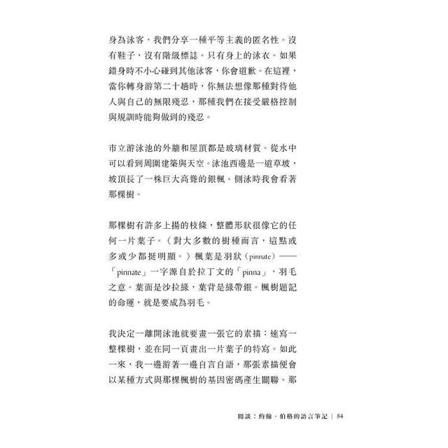 「一直以來,書寫行為對我至關緊要;它幫助我理解事物,延續人生。不過,書寫其實是分支,衍生自某個更深刻、更普遍的事物──我們和語言本身的關係。而這幾則筆記的主題,正是語言。」