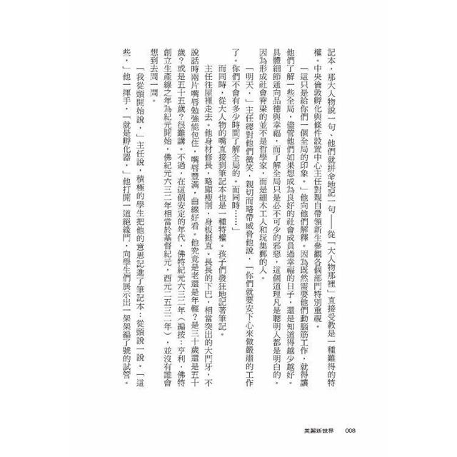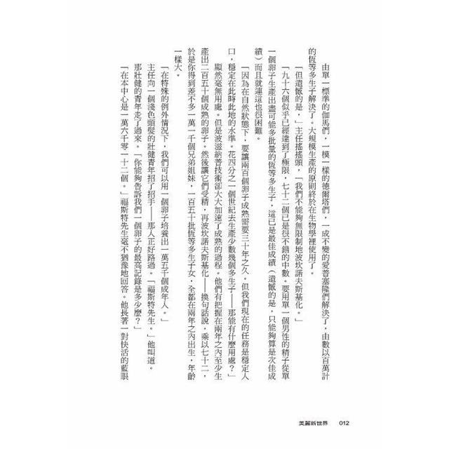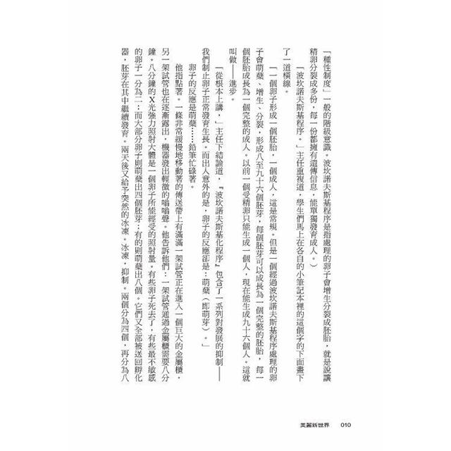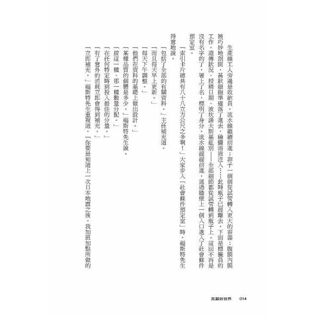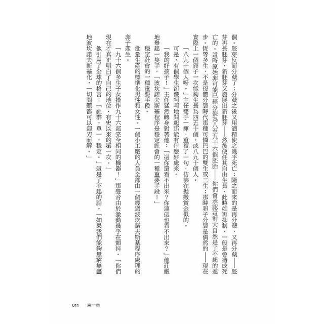 這是一部長篇小說的寓言作品,人類社會的未來圖景,透過最有效的科學和心理工程,從遺傳和基因上就已經被先天設計為各種等級的社會成員,完全淪為馴順的機器,個性和自由被扼殺,文學藝術瀕於毀滅,技術高度發達的未來社會,人類精確而完美的生活,在這個美麗新世界裡……