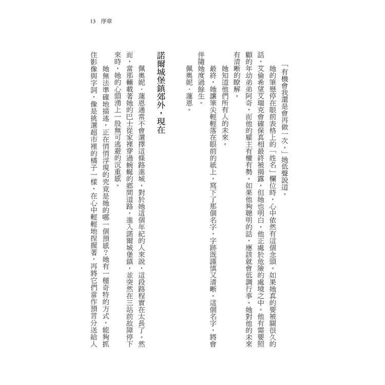 當我終於意識到她是誰時,我瞬間感覺到一股氣流從我肺部吐了出來。她就是佩奧妮‧蓮恩,那位著名的占卜師,正是她引發了法蘭西絲姑婆生命中一連串的複雜事件,甚至影響了我的人生。一九六五年,法蘭西絲才十七歲,佩奧妮‧蓮恩就預言了她的謀殺事件,而這個預言,最終成為我擁有格雷夫史當莊園的原因。