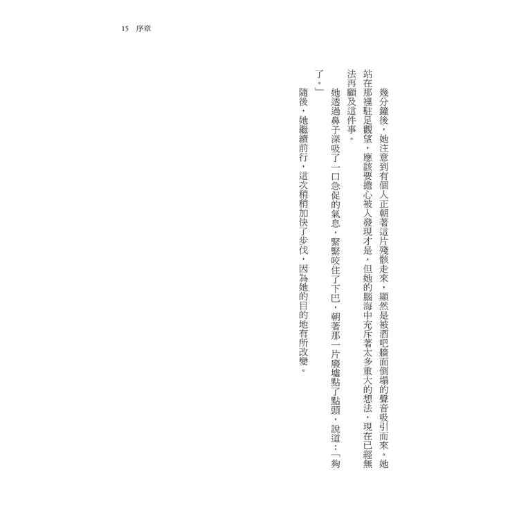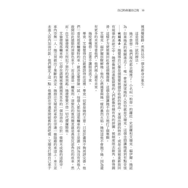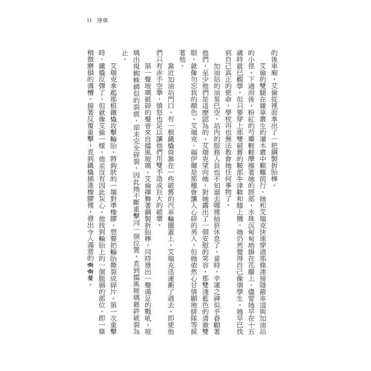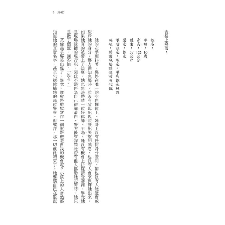 她總覺得自己的名字過於平凡,她凝視著眼前需要她簽名的入監登記表時,心中不禁這麼想著。艾倫‧瓊斯(Ellen Jones)這個名字既無法顯示出她是怎樣的人,也無法反映她過去的所作所為,更無法預示將來即將發生的事──那些她計畫要完成的事,以及那些她知道自己必須設法逃避的事。