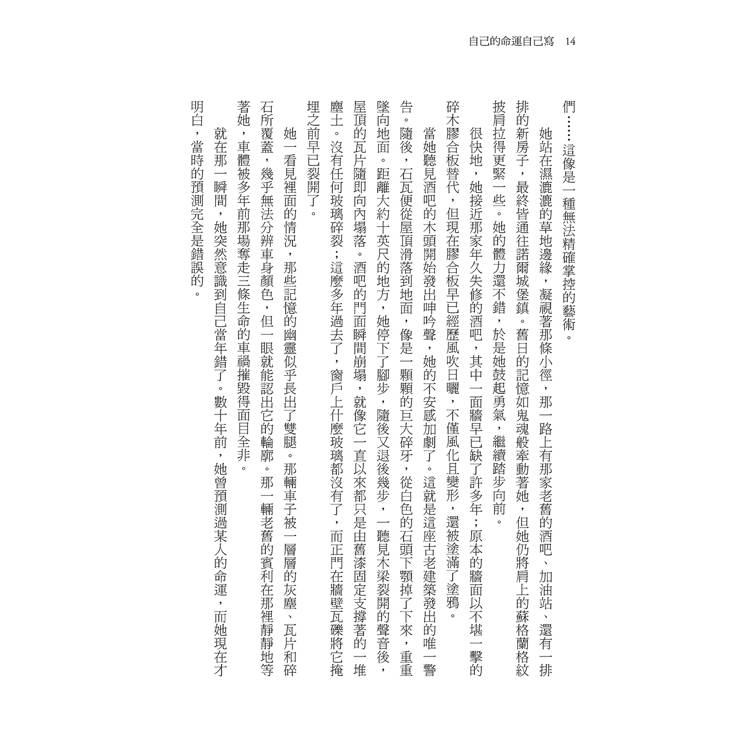 「見到預言以如此重大且可怕的方式成真,就像我對法蘭西絲的預言一樣,我可能會讓人覺得有些可怕。不過,你放心,我認為向不願意聽預言的人透露命運,是不道德的行為,不論那則預言是否與他有關。不過,你……」她停頓了一下,視線飄向我身後的房子。「你將會明白,你需要這一則預言,然後會來找我。我只希望你還來得及。」