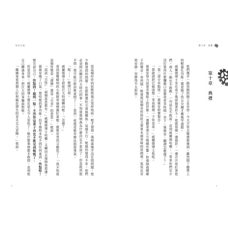 「看吧,馬上證明我說的話。」威蘭德博士咕噥,「你自己活在裡面,所以不知道。時空之城當然動盪啊,小鬼!如果你能完全脫離時間和歷史來看,你會發現時空之城的過去和未來跟二十世紀一樣,充滿變化。不然你以為為什麼歷史上每一年發生了哪些事情我們都知道,卻對時空之城的歷史幾乎一無所知?真正的原因是什麼?當然就是因為歷史不斷在改變,就算記錄下來了,也會變成錯的。請問你知道時空之城明天會發生什麼事情嗎?不知道嘛,我也不知道。」