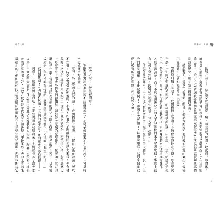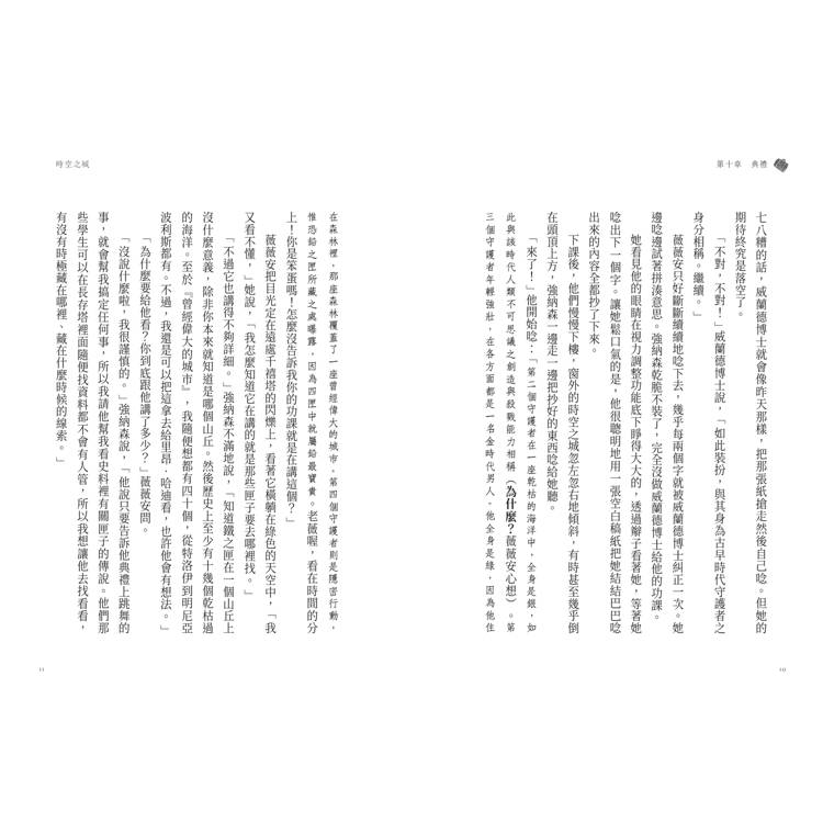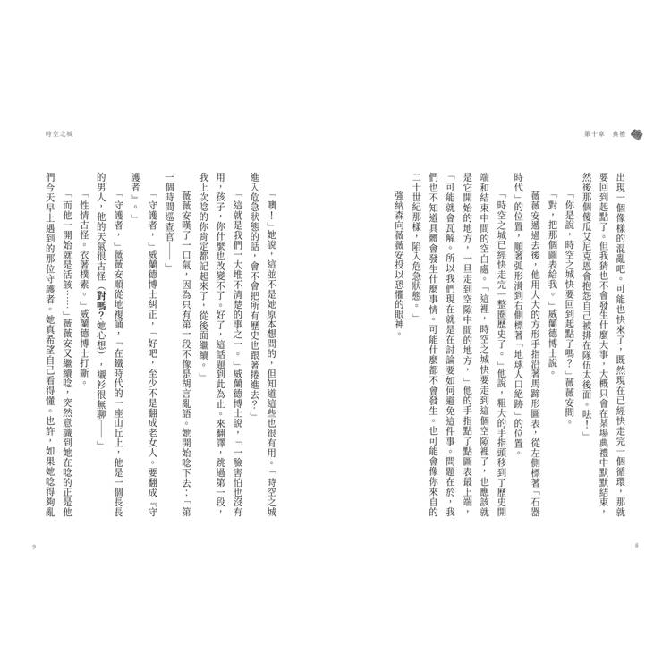 「想拖延刑期,是吧?」威蘭德博士咕噥。不過他平靜地吐著煙,思索要說什麼。「你剛從動盪紀元回來,的確應該感到困惑。」他說,「活在動盪紀元裡的人,是分辨不出自己所在的時代是否動盪的。只有身在時空之城這樣的外部,才能看得清楚。而且,不只是動盪紀元的人不知道他們未來會怎麼樣,事實上沒有任何人會知道。動盪紀元裡發生的事,每天都在改變。」