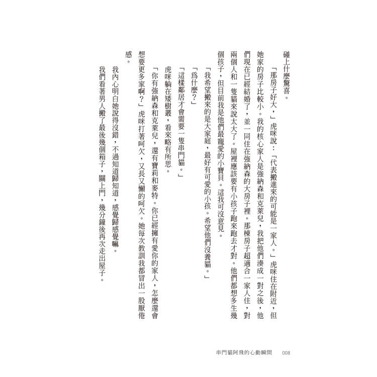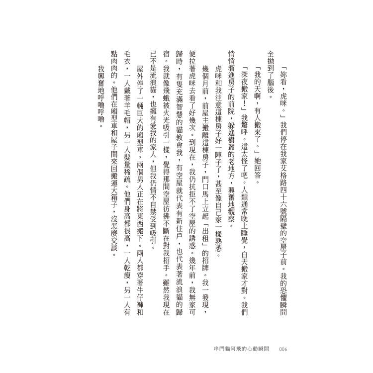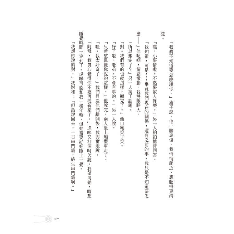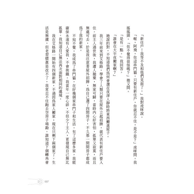 「喔,阿飛,你這串門貓。只要有新住戶,你就忍不住,是不是?」虎咪問。我搖搖頭。「你不覺得很怪嗎?」她又問。