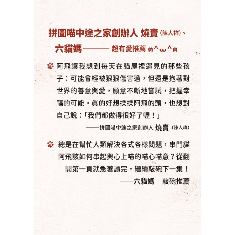 ♥阿飛這孩子,根本是「貓界社工」吧!哪裡有誤會,哪裡有人類需要被撫慰,他就一定在哪裡穿梭,要不要來拼圖喵兼差串門呀?他讓我想到每天在貓屋裡遇見的那些孩子:可能曾經被狠狠傷害過,但還是抱著對世界的善意與愛,願意不斷地嘗試,把握幸福的可能。真的好想揉揉阿飛的頭,也想對自己說:「我們都做得很好了喔!」 ——拼圖喵中途之家創辦人 燒賣(陳人祥)