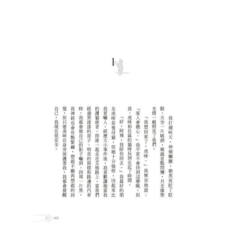 「好,阿飛,我陪你回去。」我最好的朋友虎咪是隻母貓,但她十分強悍,凶起來比我更嚇人。經歷大小事件後,我喜歡讓她當我的護貓使者。即使一起走在艾格路上,當我們經過黑漆漆的房子、明亮的街燈和路邊的汽車時,我都會被自己的影子嚇到。四周一片黑,我神經也會有點緊繃,想起不願再想起的回憶,但只要虎咪在我身旁保護著我,我都會提醒自己,我現在很安全。