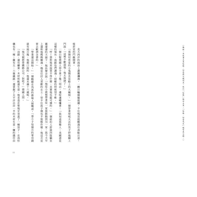 「沒錯,還有礦業、木材和航運生意。他老爸在聖地亞哥蓋了一棟房子,在洛杉磯也有一棟;擁有五、六條鐵路,還掌握了太平洋沿岸一半的木材生意,賺的錢任由妻子揮霍,」費城人懶洋洋地接著說道,「他妻子說在西部待不慣,總是神經質地帶著那小子到處跑,我猜是要想盡辦法讓孩子開心吧。他們在佛羅里達、阿迪朗達克、萊克伍德、溫泉城和紐約來回住。他現在也不會比一個旅館的接待員好多少。等他在歐洲完成學業後,才是徹頭徹尾的災難。」