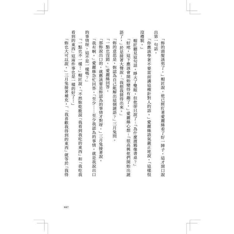 愛麗絲開始覺得,坐在河岸邊陪著姊姊實在很無聊,身邊也沒什麼事情可以做。她偷偷朝姊姊在看的書瞄了幾眼,但裡面既沒有插圖,也沒有對話。「一本書裡要是連圖畫和對話都沒有,那還有什麼好看的呢?」愛麗絲心想。