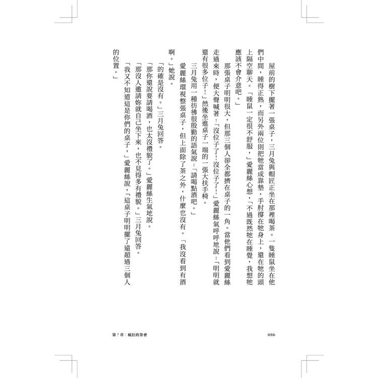 愛麗絲追逐白兔跌落洞口、越過鏡面進入顛倒世界,開啟荒誕而奇幻的冒險,她遇見了各種難題與奇異角色,會說謎語的生物、失序的茶會、以棋步推進的旅程。這裡不存在常理,連她也開始懷疑自己究竟是誰,看似無理又孩子氣的情節,暗藏對社會與大人的嘲諷,也映照成長的勇氣。