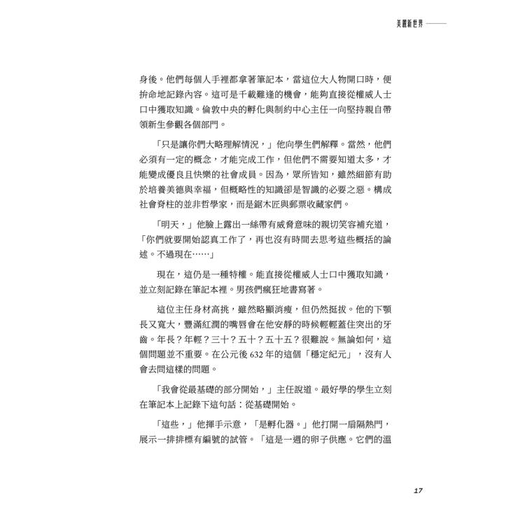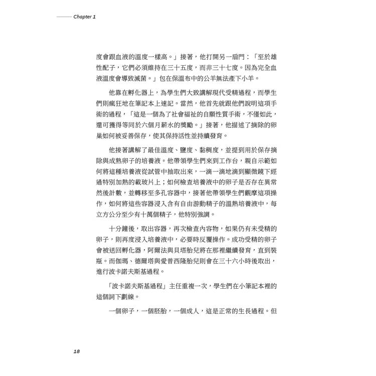 主任搓了搓雙手,「太好了!」他說,「這簡直就像是刻意安排的一樣。」動作最快的嬰兒已經抵達目標。他們的小手遲疑地伸出、觸摸、抓取,撕開了那些變幻莫測的玫瑰花瓣,弄皺了那些被光線照亮的書頁。主任一直等到所有嬰兒都快樂地忙起來後,他接著說:「仔細看。」他舉起手來,示意開始行動。