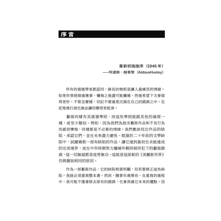 藝術同樣有其道德準則,而這些準則就跟其他的倫理一樣,或至少類似。例如,因為我們為拙劣藝術作品和不良行為而感到懊悔,同樣都是不必要的情緒。我們應該找出作品的缺陷,承認它們,並在未來盡力避免。耽溺於二十年前的文學缺陷中,試圖補救一部有缺陷的作品,讓它達到最初也未能達成的完美境界,或在中年時期努力彌補年輕時候所犯下的藝術錯誤,這一切無疑都是徒勞無功。這就是這部新的《美麗新世界》仍與舊版相同的原因。