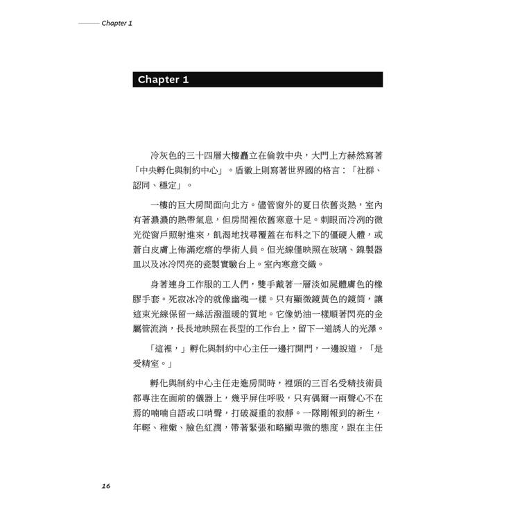 「我們可以把整個地板都通電,」主任大聲解釋。「但這樣已經夠了,」他向護士示意。爆炸聲和警鈴都停止了,刺耳的警報聲從高音慢慢降為沉默。原本僵硬抽搐的嬰兒們鬆弛了下來,那些先前瘋狂般的啜泣與尖叫,再次變成普通的恐懼嚎哭。